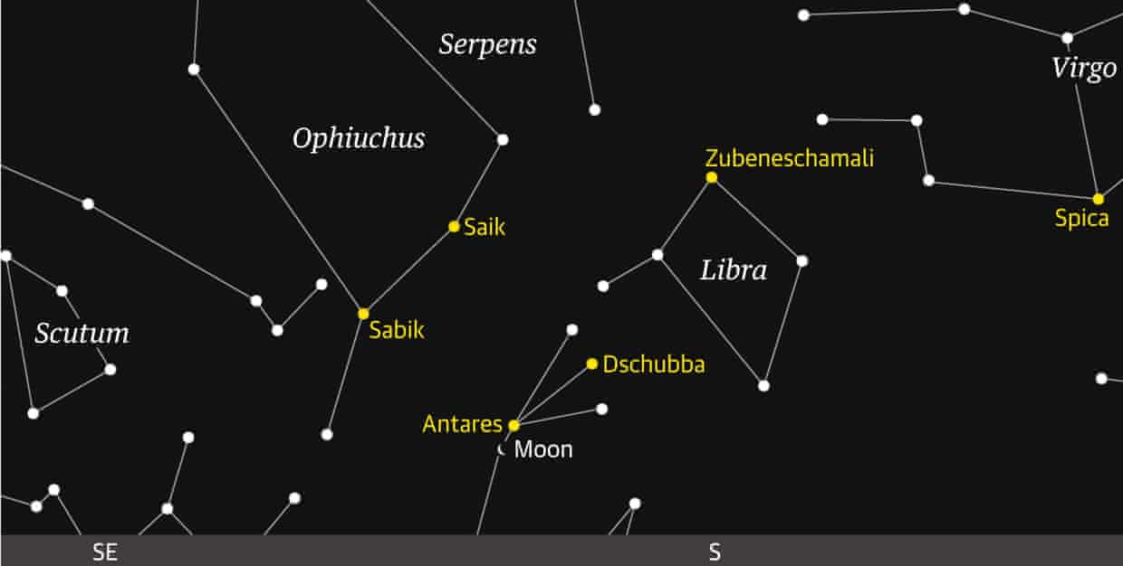 Atmospheric conditions may impact the visibility of Antares, potentially diminishing its brilliance due to haze. Nevertheless, the crescent moon will remain visible to the naked eye, serving as a helpful guide for locating the star in the sky.