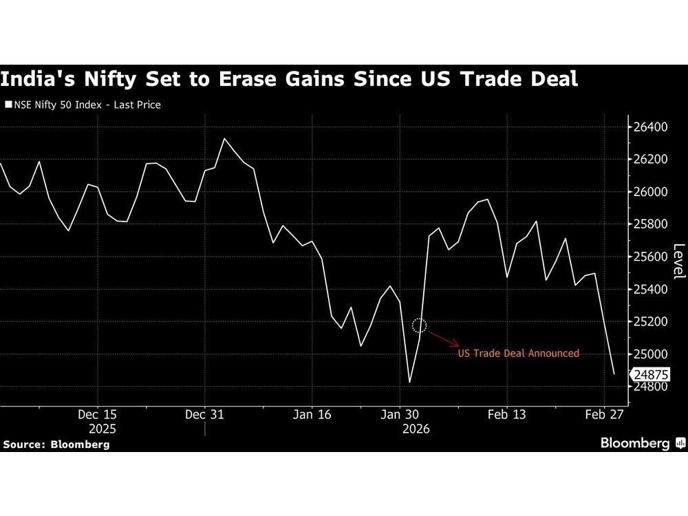 URGENT UPDATE: Indian stocks nosedived on Monday, reflecting a significant decline across Asian markets amid escalating violence in the Middle East. The NSE Nifty 50 Index fell by as much as 2.1%—the steepest drop in over a month—erasing previous gains following India’s trade agreement with the United States on February 2, 2024.