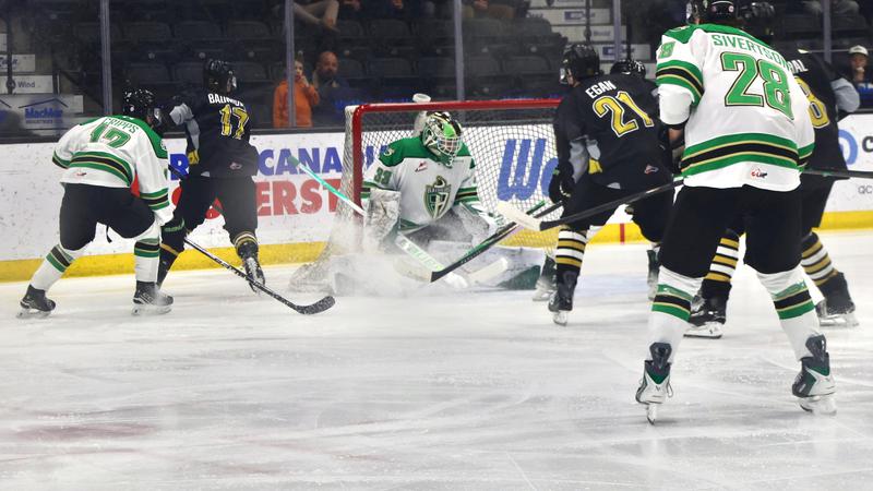 As the game progressed into the second period, defensive prowess dominated, with both teams exchanging high-stakes chances. Fortin emerged as a wall for the Raiders, making a spectacular pad save that left fans in awe. Meanwhile, the Wheat Kings’ Filip Ruzicka matched Fortin’s efforts with critical saves, keeping the game tied.