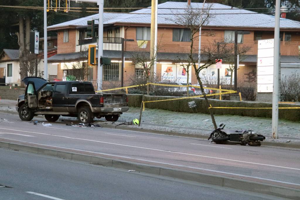 Witnesses report that a marked police vehicle had been following a stolen black Ford F350 before the collision took place several blocks away at 128 Street. While some social media chatter suggests the scooter rider has unfortunately died, the Surrey Police Service (SPS) has not confirmed this, citing an ongoing investigation by the Independent Investigations Office of B.C. (IIO).